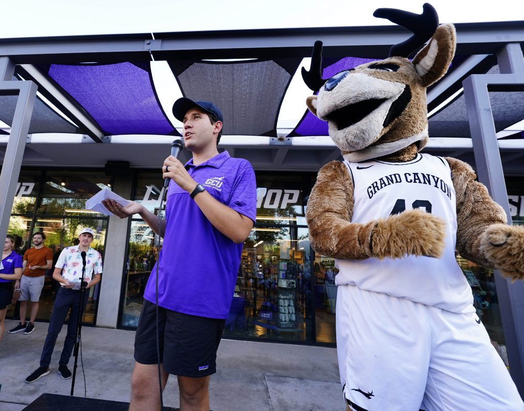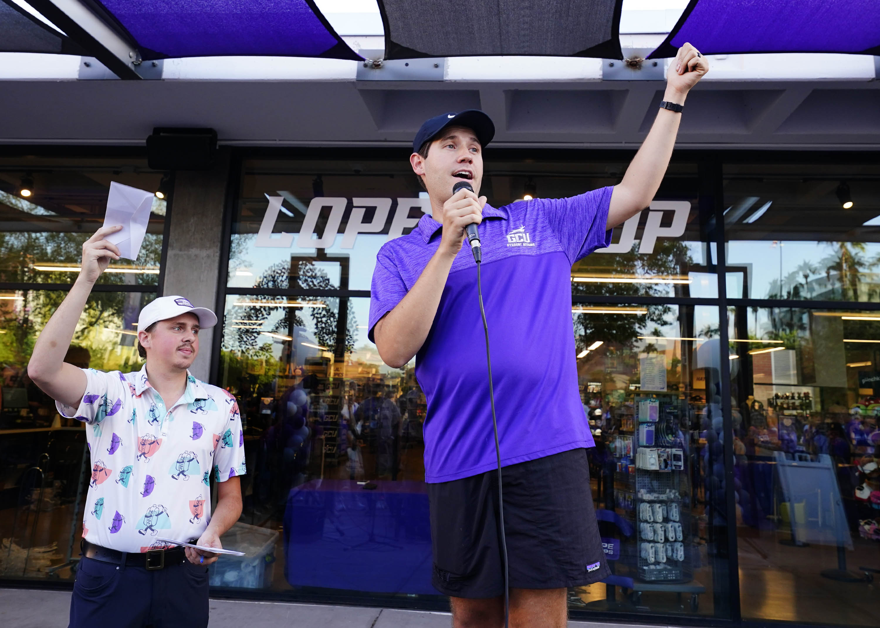 Welcome Programs Manager Garrett Abeyta (right) and Lope Shop manager Garrett Miller announce the winning name for the Thunderbolt shopping spree event during Family Weekend on Oct. 11, 2025. -