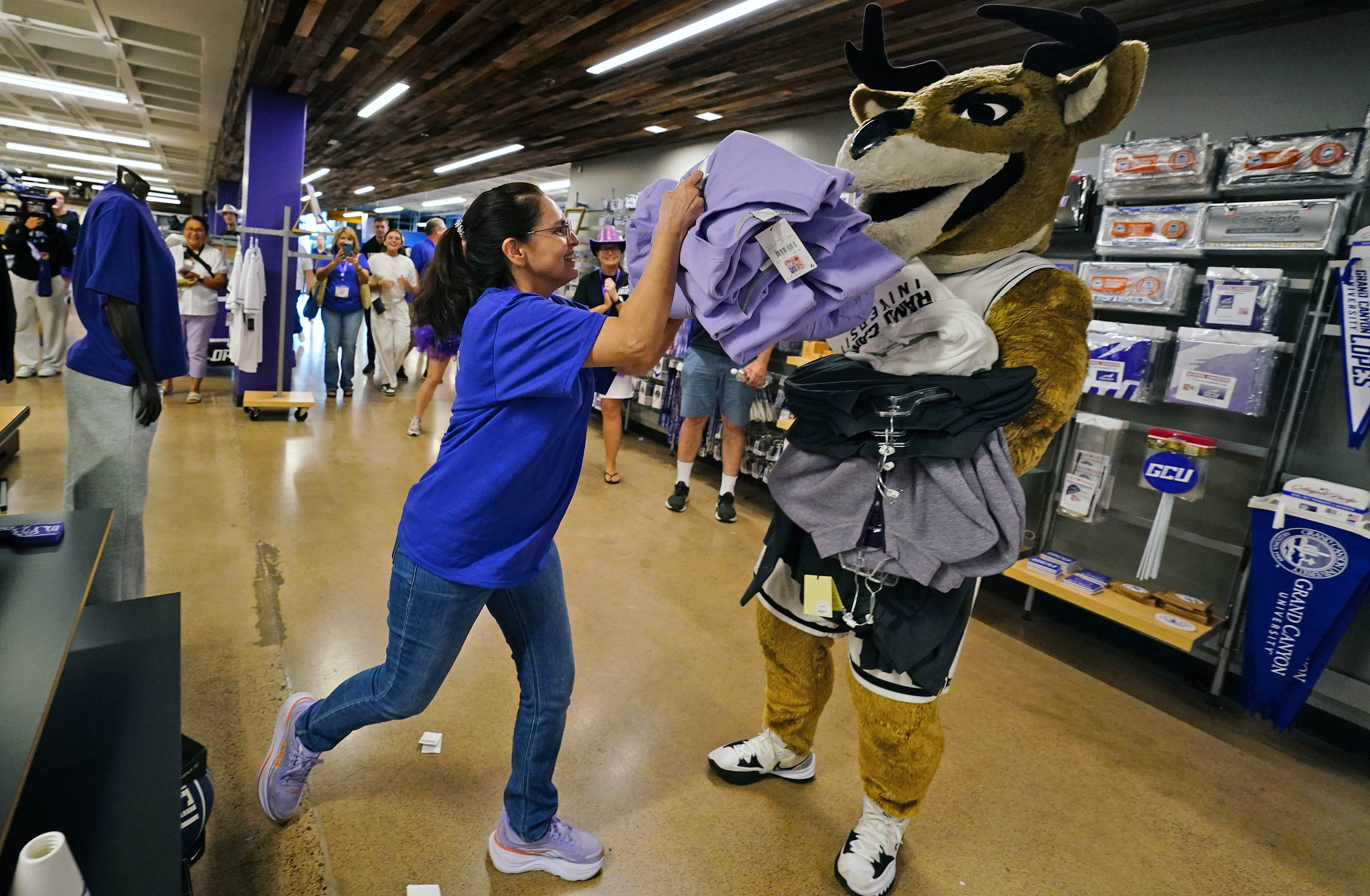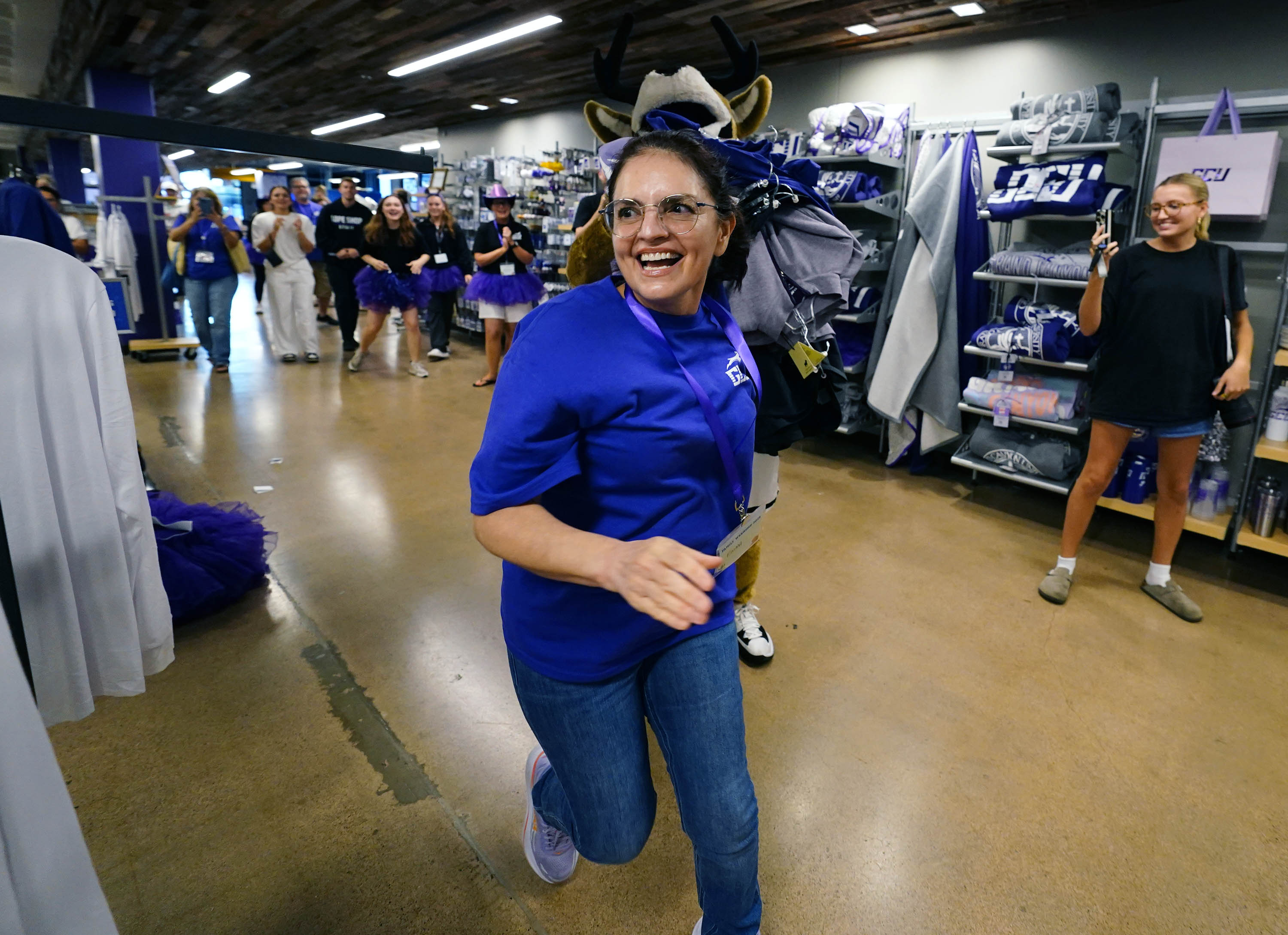 Emma Hogan takes off with Thunder in tow on her 30-second shopping spree in the Lope Shop during the Thunderbolt event at Family Weekend on Oct. 11, 2025. -