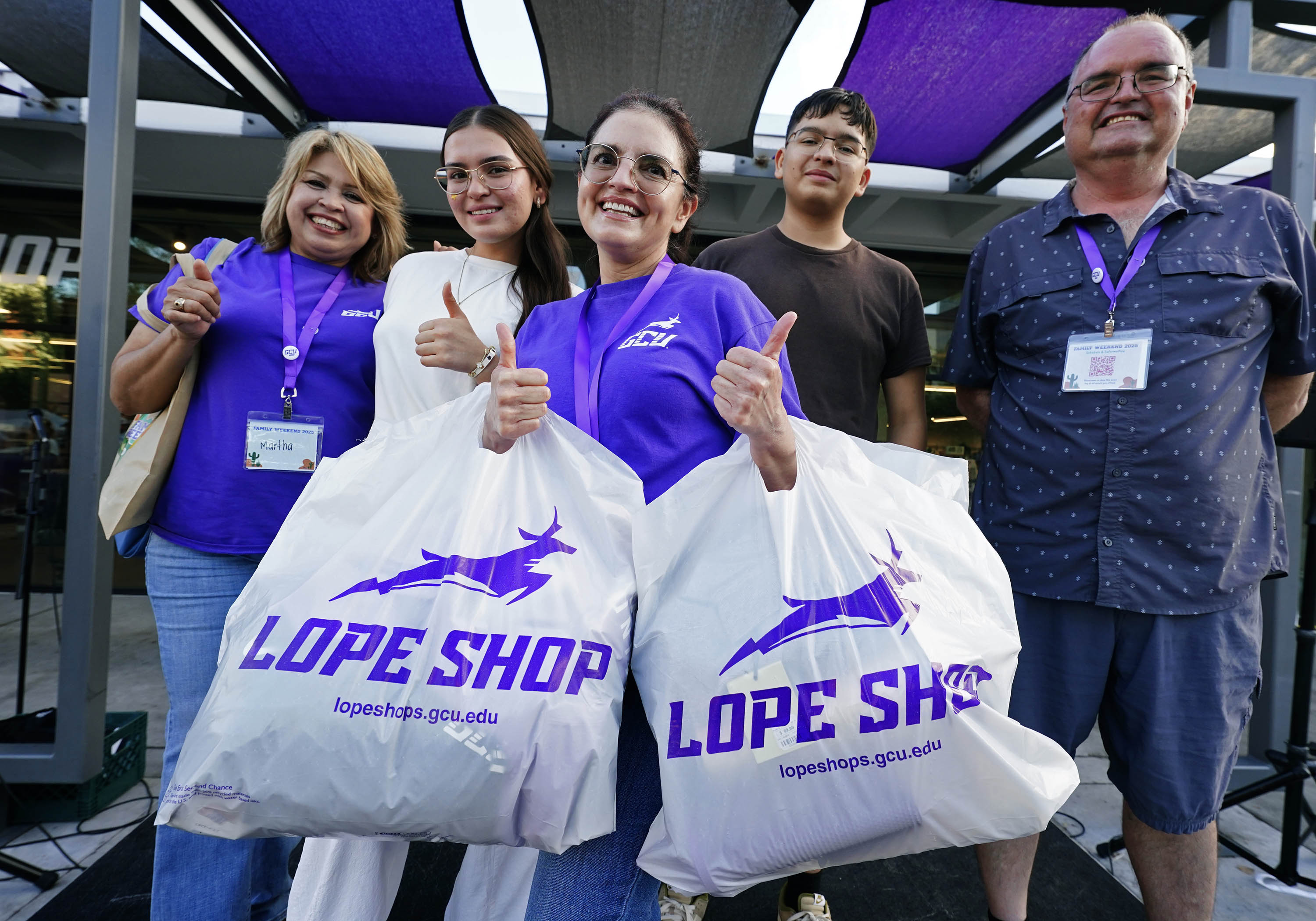 Emma Hogan and family, including her niece (second from left), who is a GCU student, with her $1,594 worth of Lope Shop merchandise following the Thunderbolt event at Family Weekend on Oct. 11, 2025. -