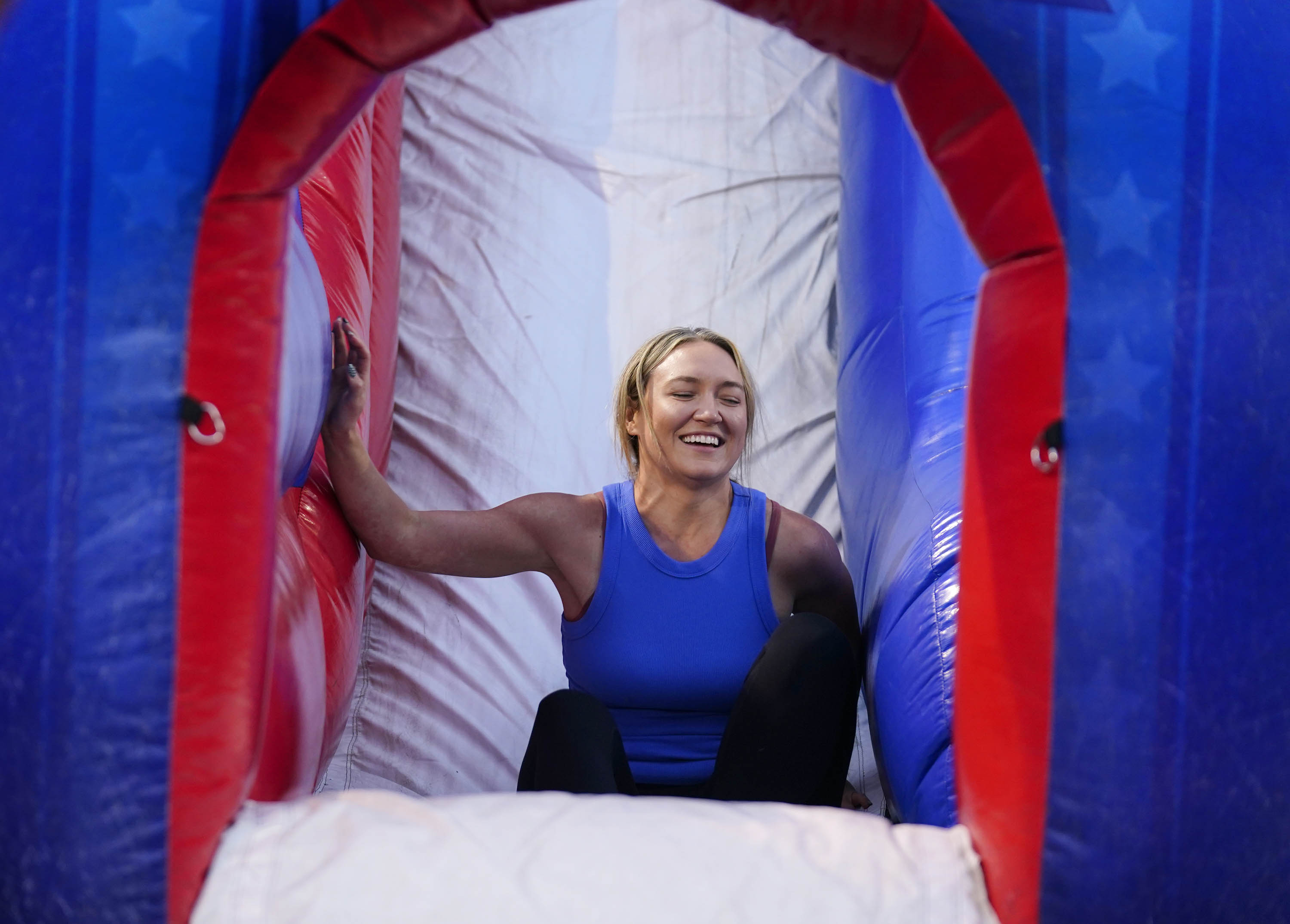 A family member tries to navigate the All Star inflatable obstacle course during the Family Weekend Carnival on Oct. 11, 2025. -