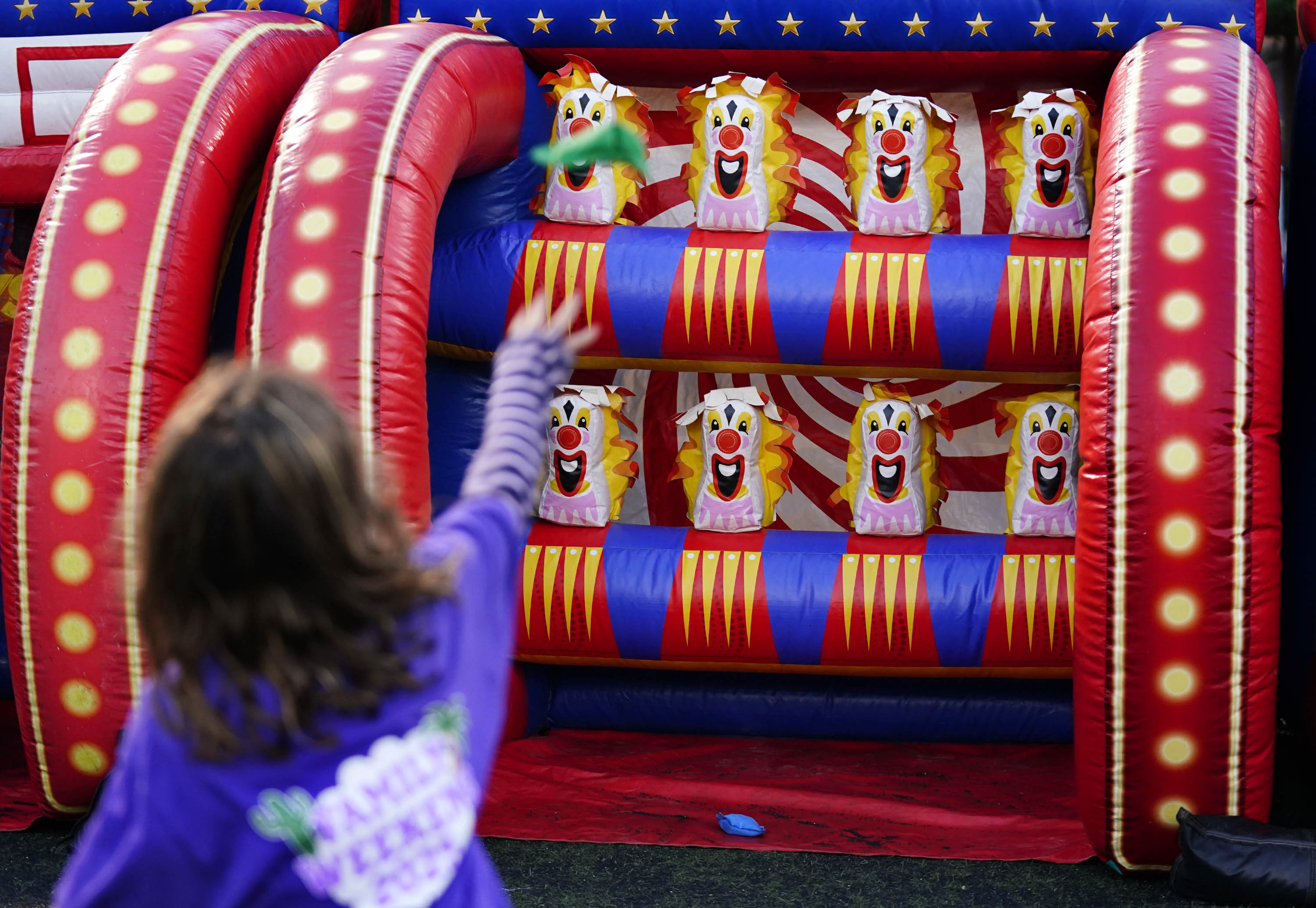 A young Lope tries to knock down clowns with a bean bag in a game during the Family Weekend Carnival on Oct. 11, 2025. -